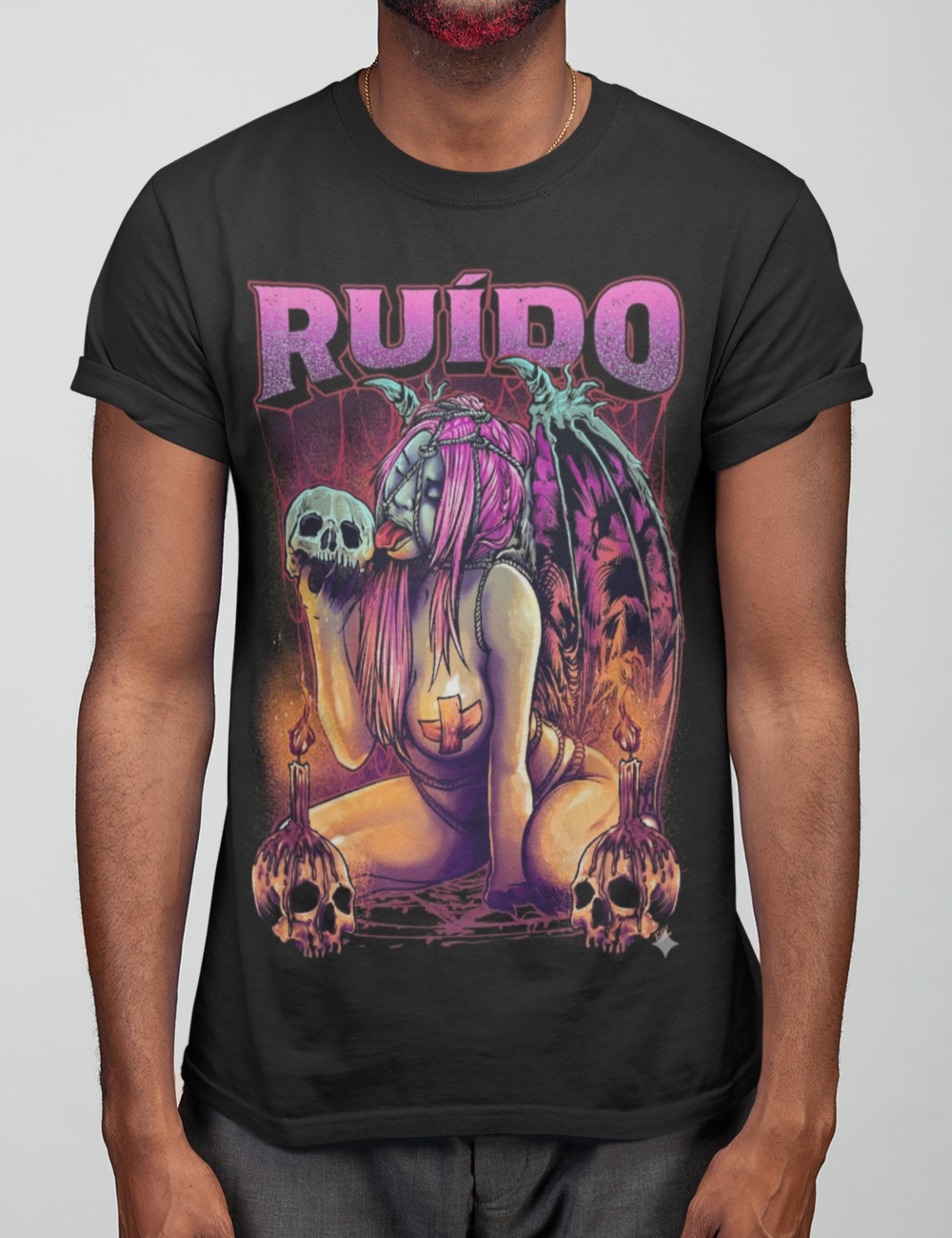 A Camiseta Ruído Dark Angel é uma peça feita para quem carrega atitude, rebeldia e identidade própria. A estampa traz uma arte intensa e provocadora: uma figura angelical sombria com asas, elementos ocultos, caveiras e velas, criando uma atmosfera dark que mistura sensualidade, mistério e poder.